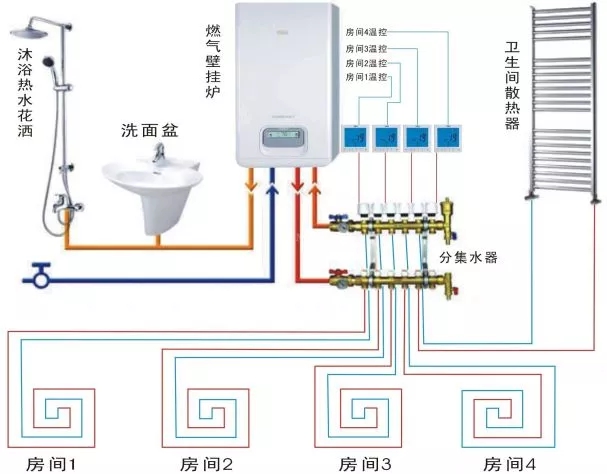 完整的水地暖系統(tǒng)離不開(kāi)熱源、控制、管道、保溫四大部分。采暖壁掛爐是地暖的熱源中心,滿足地暖整個(gè)系統(tǒng)運(yùn)行所需的熱量;保溫層、反射膜、采暖管道、回填層等地面部分保證系統(tǒng)的保溫效果;分集水器和溫控器維護(hù)系統(tǒng)的正常運(yùn)行。